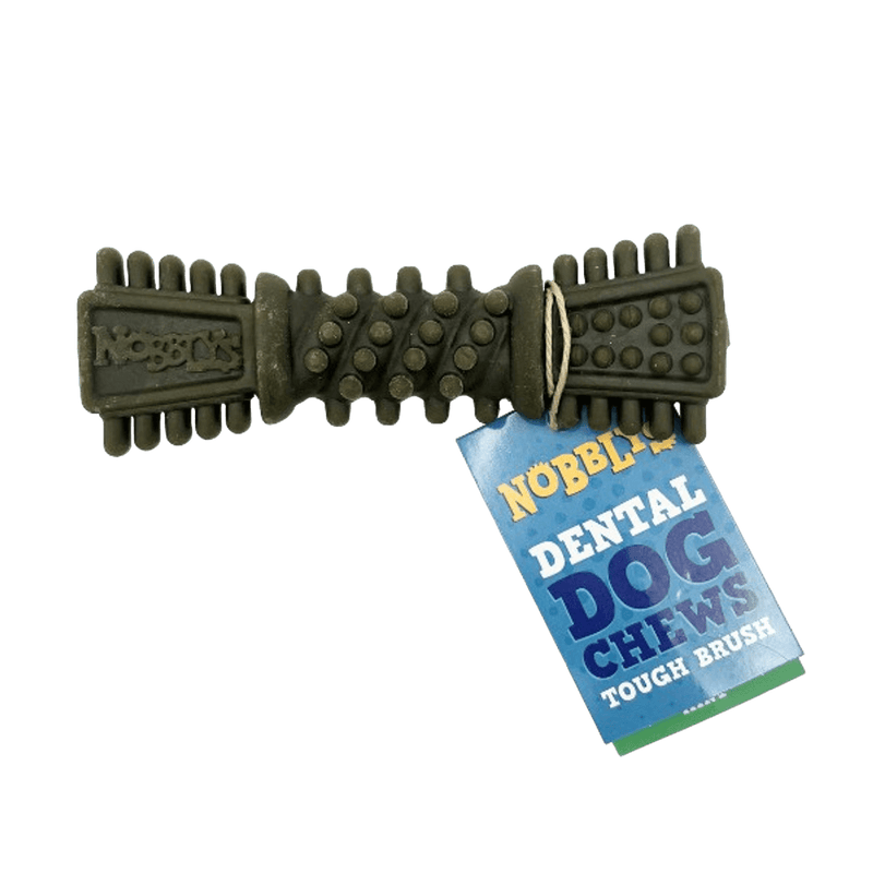 Unique Shape and Texture The innovative shape and texture of the Nobblys Tough Brush Mint feature strategic nobbles that work to reduce tartar build-up and fight plaque. These longer nobbles also provide an easy grip for your dog’s paws, making chewing both fun and effective.