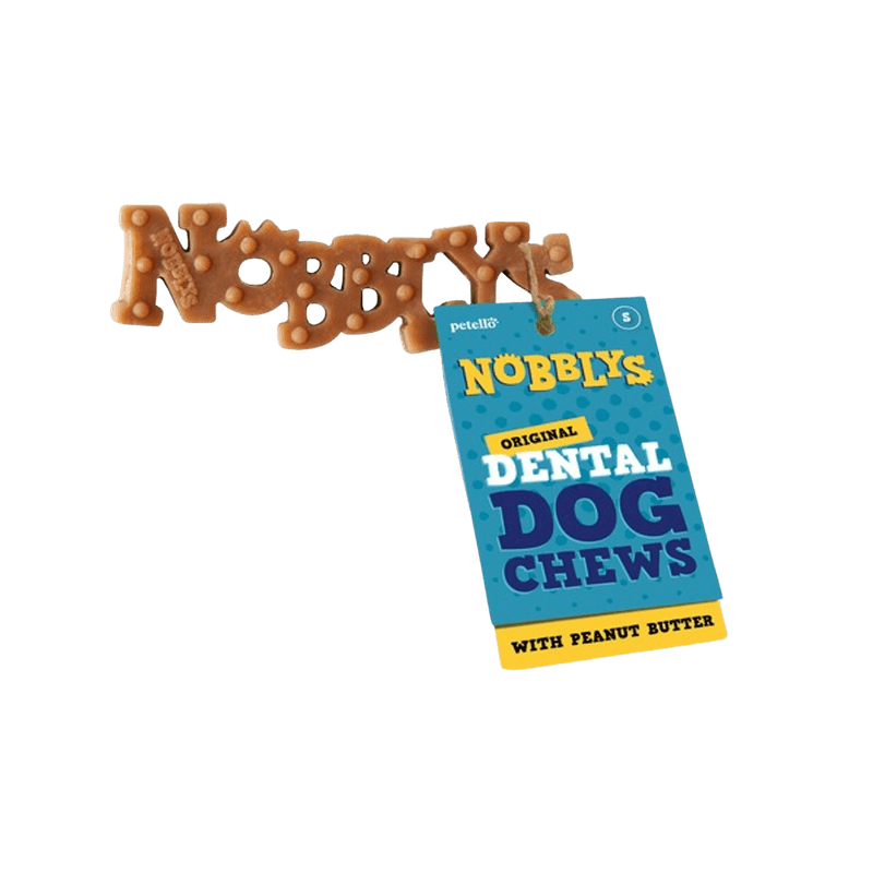 Petello Nobblys dental dog chews are natural vegetarian chews that are made with peanut butter. Each chew promotes dental health by helping to reduce tartar build-up thanks to its unique shape and nobbles!