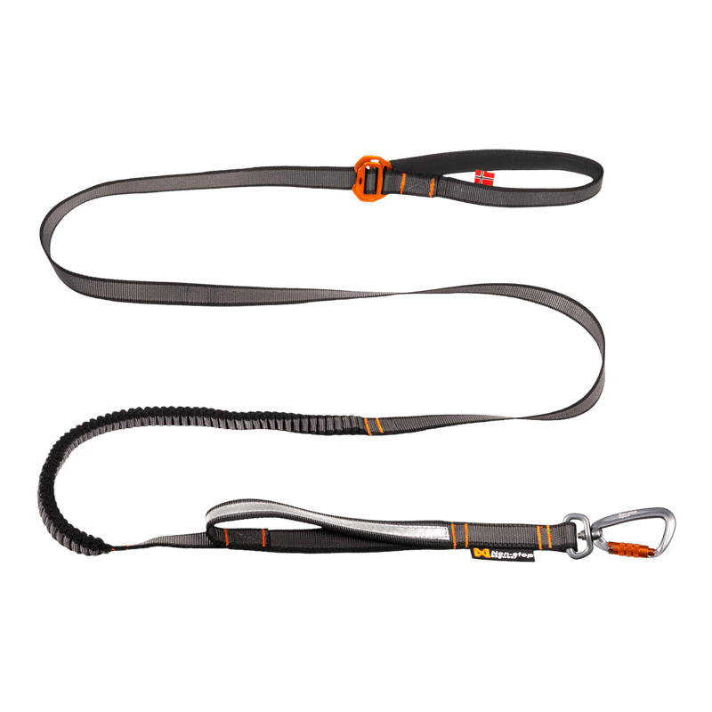 Touring bungee adjustable from Non-stop dogwear consists of three elements. A handle close to the dog for extra control, an elastic element to soften the dogs movement, and an adjustable aluminum buckle to adjust the lenght of the leash. With this function you can easily adjust the leash to fit around your waist or a tree. Touring bungee adjustable has integrated 3M reflective parts and comes with a Twistlock carabiner.